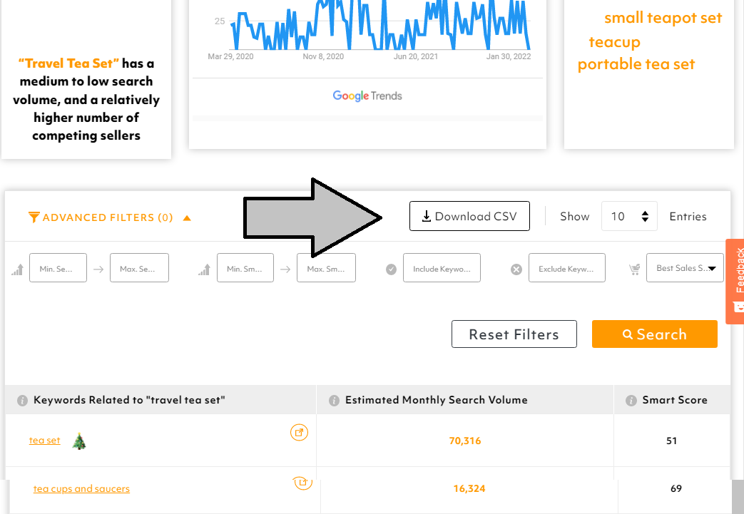 To download and export your results, all you have to do is click the “Download CSV” button that you can see on the right-hand side of the “Advanced Filters” section.