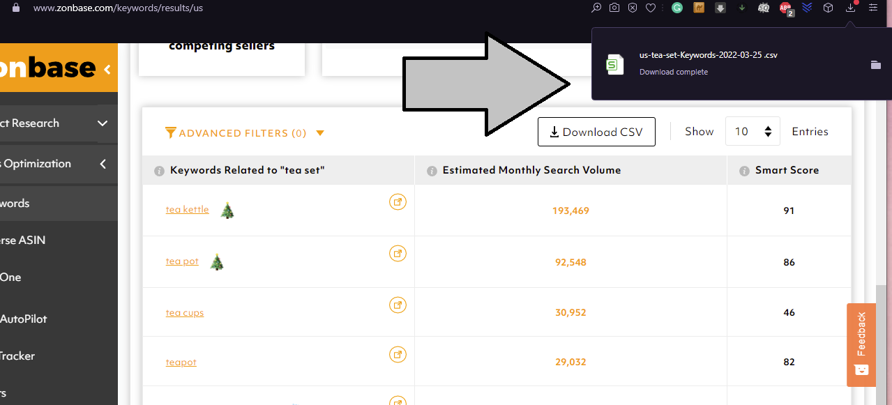 The ability to download and export the results is an important feature of the Keyword Tool. This feature allows you to save your data for external analysis. This is especially helpful if you want your keyword search data to be analyzed by a third party without letting them log in directly to your Zonbase account.