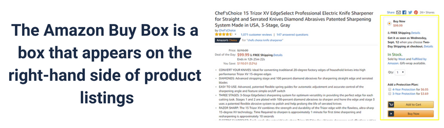 The Amazon Buy Box refers to a box that appears on the right-hand side of product listings. It features the product’s price, shipping, and seller information.